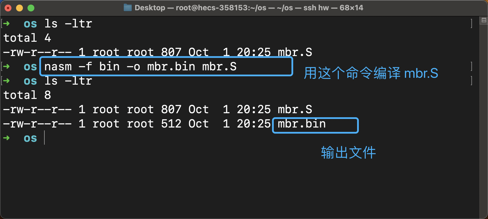 好啦,接着我把 mbr.S 放在文件中进行编译,其中我们使用命令 nasm -f bin -o mbr.bin mbr.S