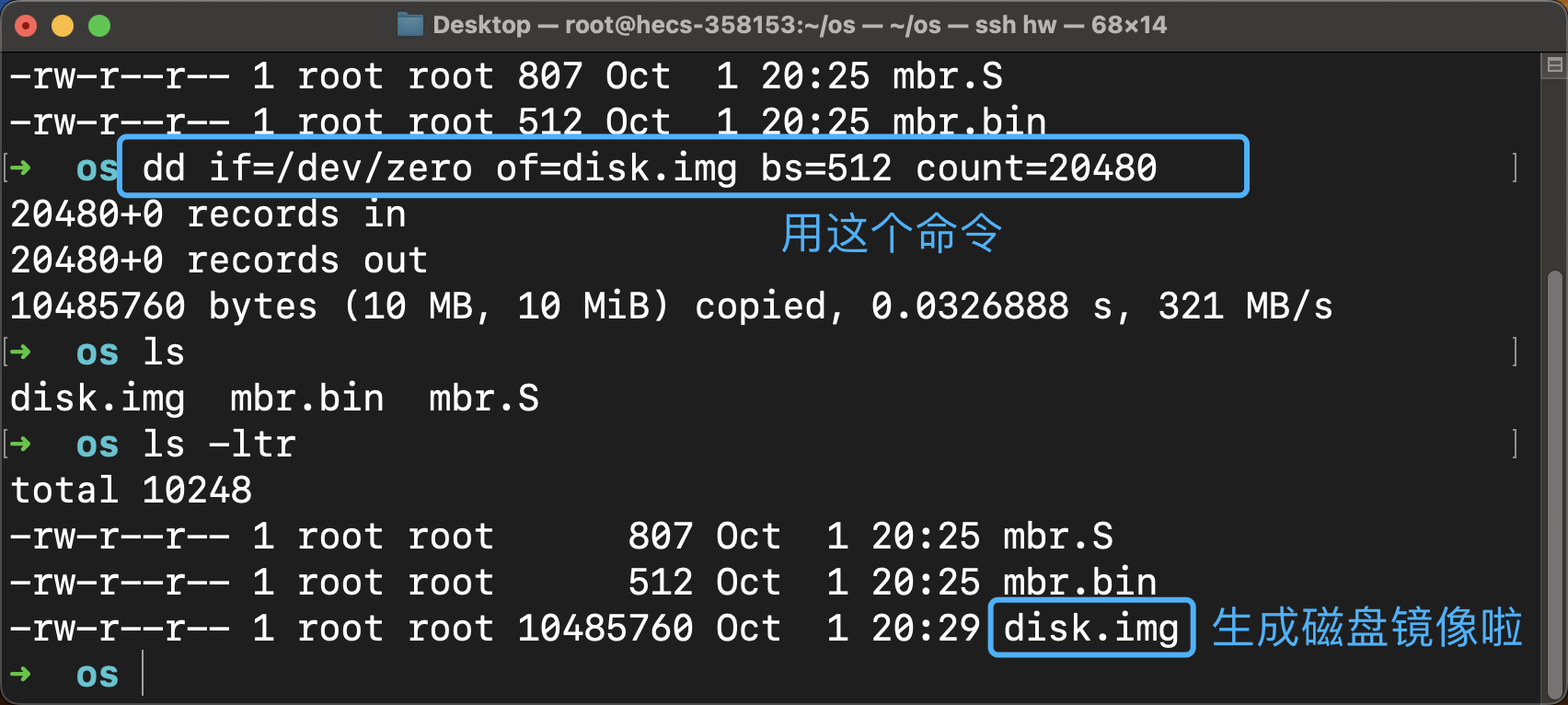 使用命令 dd if=/dev/zero of=disk.img bs=512 count=20480