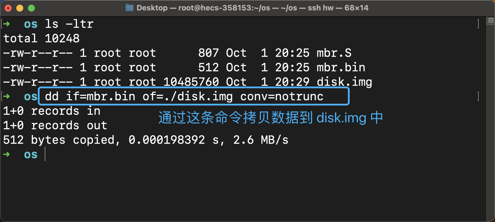 我们可以通过命令 dd if=mbr.bin of=./disk.img conv=notrunc来把 mbr.bin 中的数据拷贝到 disk.img 中