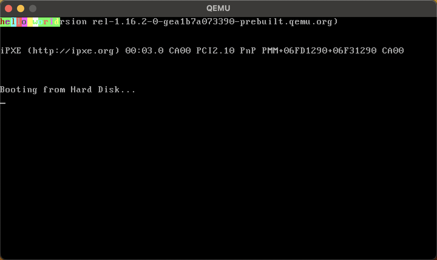 你会发现屏幕上还有一些其他的字,那是因为我们并没有清空屏幕上的内容,当我们在 0xb8000 处开始写入数据的时候,原来这个地方的数据就被我们覆盖啦,所以就变成了图中的这个样子。