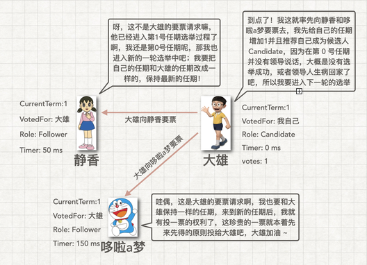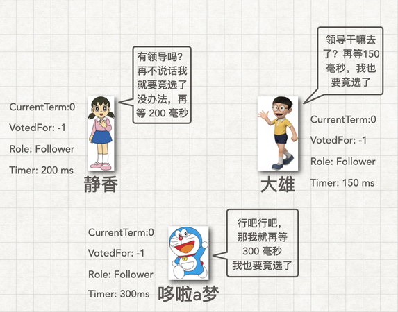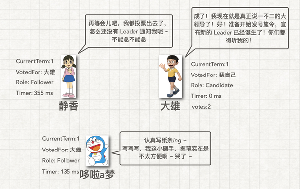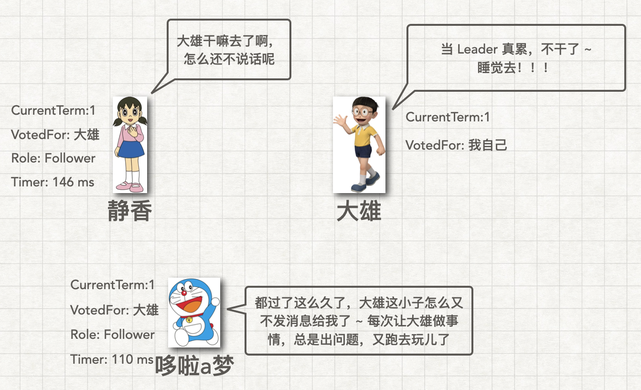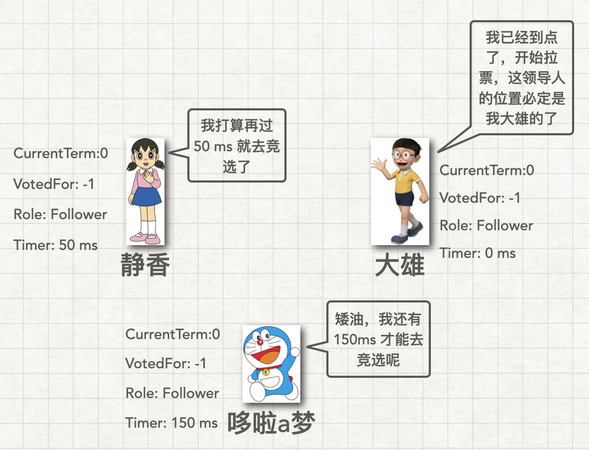 在一组计算机刚刚启动的时候是没有 Leader 的,这时候每个节点都在等待时钟超时,如果自己的时钟一旦超时,就主动发起选举,我们可以发现,大雄的倒计时剩余的时间最短,所以一定是大雄率先发起选举。