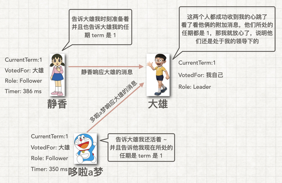 虽然哆啦a梦并不会收到大雄的回复,由于这是一个3节点的集群,所以只要哆啦a梦能拿到2票,就可以成功当选 Leader
