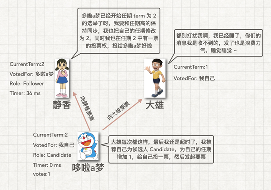 重复刚才的过程,哆啦a梦增加自己的任期等一系列工作,发送要票请求给其他人