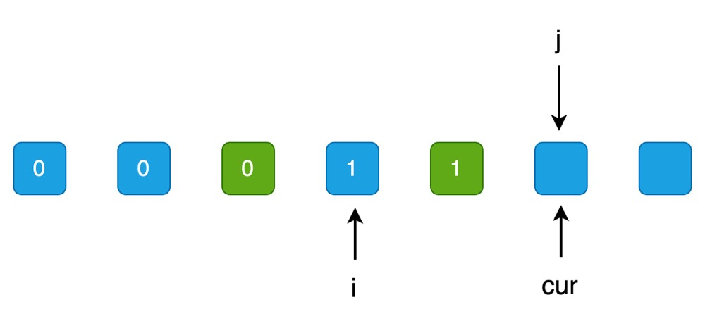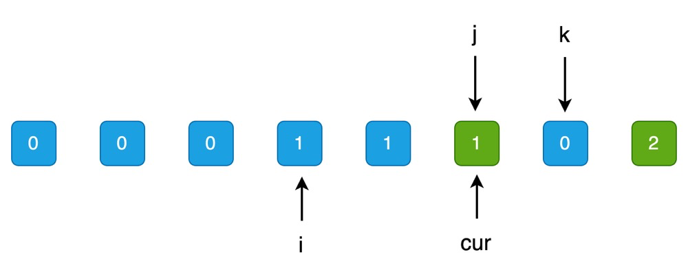 你可以发现,我们怎么才能让 num[0...i) 的区间扩大呢?显然我们这时候没办法扩大,一旦扩大,我们的数据就会覆盖掉 nums[i...j) 这个区间里面的数据,所以我们可以让 nums[i...j) 这个区间的第一个元素放到 j 所在的位置,其实就相当于移走了最开头的元素放到了 nums[i...j) 这个区间的尾巴上,然后为了维护 nums[i...j) 这个区间的定义,我们需要让 j 的值增加 1;好巧不巧,这个时候 cur 的值是等于 j 的值的,所以我们直接交换 nums[i] 和 nums[j] 的值就可以了,然后我们分别让 i, j, cur 的值分别都增加 1 即可,随后就变成了下面这样子。