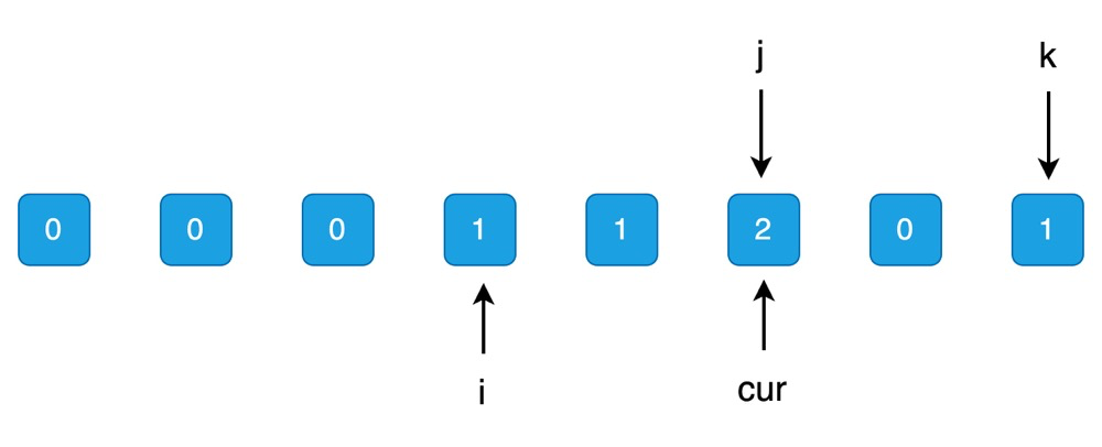 cur遍历nums数组,每当我们遇到不同的值的时候,我们就将它放在不同的区间中,并对这三个区间进行维护即可